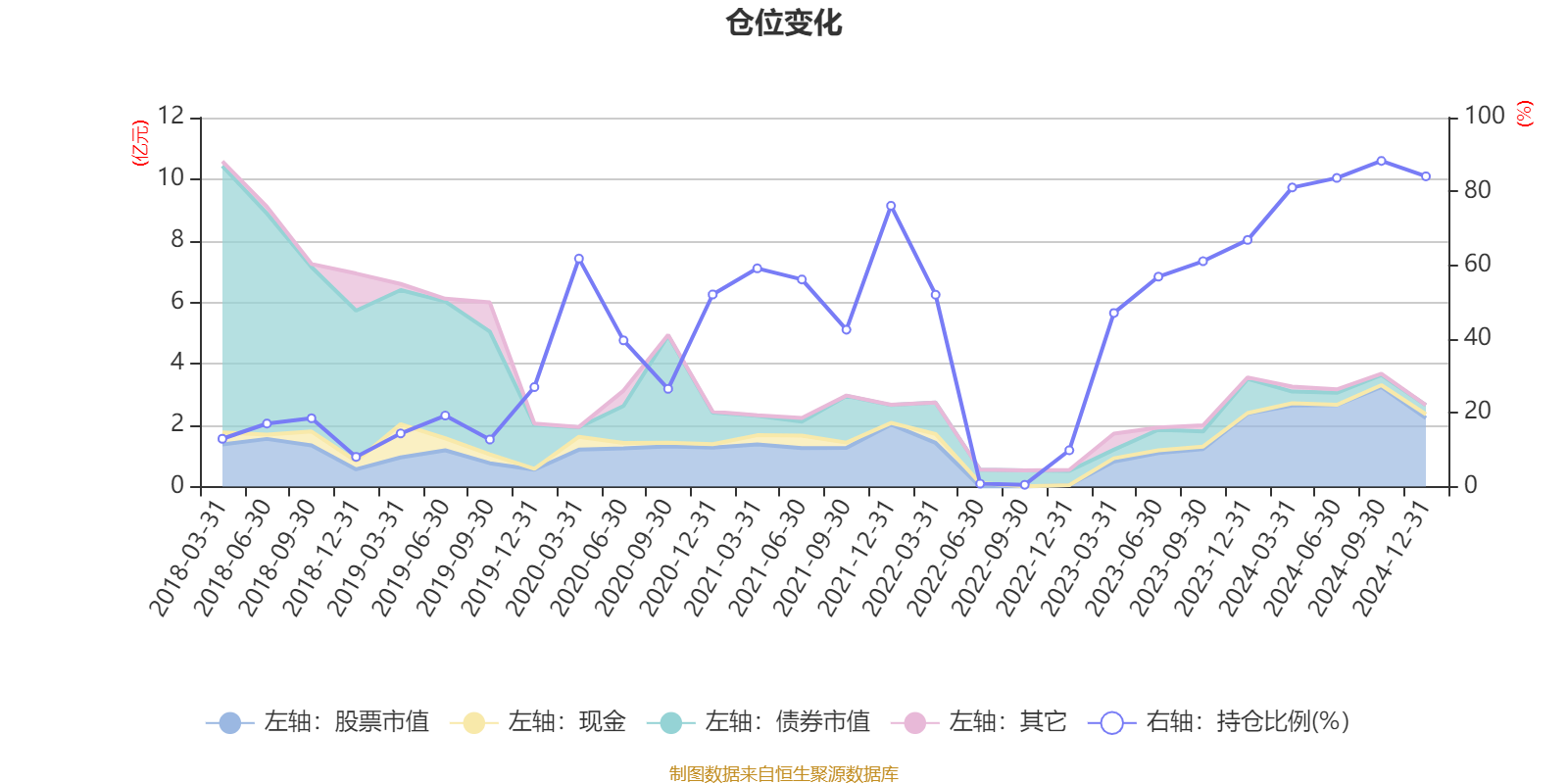 据定期报告数据统计,近三年平均股票仓位为52.67%,同类平均为79.89%。2024年三季度末基金达到88.26%的最高仓位,2022年三季度末最低,为0.49%。
